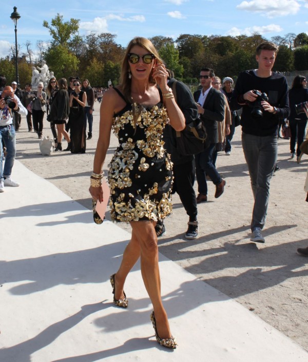 Yesterday before the Valentino S/S 2013 show, I spotted Anna dello Russo in this opulent look which I have liked a lot. This black mesh dress was undoubtedly Dolce & Gabbana’s F/W 2012 collection’s hero piece, with hand-embellished gold discs, freshwater-inspired faux pearls and breathtakingly intricate beads paying tribute to homespun Italian artistry. Crafted with a shape-cinching built-in body and a skirt that flares as soon as it hits the hips, this structured style will sculpt the label’s beloved hourglass silhouette. To shop her outfit, please click on the highlighted product descriptions below.
