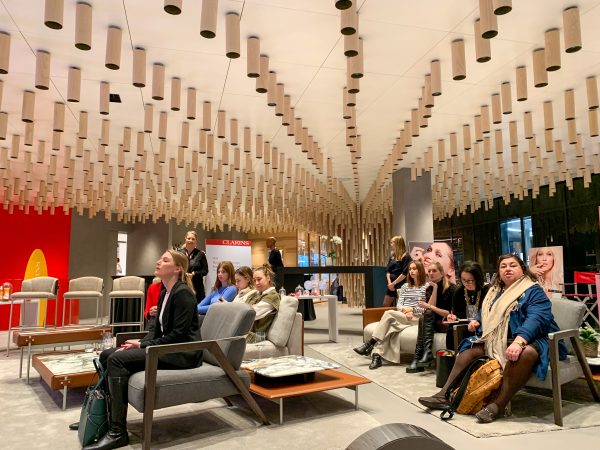 Last month, I attended the CLARINS press conference at 1904 Designed by Lagonda, a new restaurant in Zurich that combines design with Haute Cuisine. In the lounge area, that is open already in the morning for business meetings or to just have a coffee, a red wall catches your eye. The perfect backdrop for CLARINS that are famous for the red thread in their logo.