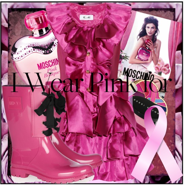 October is Breast Cancer Awareness month and wearing pink is a great way of showing your support. I am in love with this uber-cute pink ruffled silk-mikado mini dress by Moschino and those lace-up fuchsia rubber rain boots by RED Valentino.