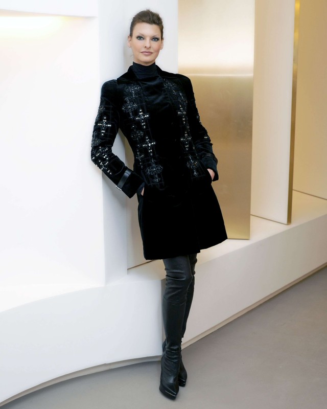 Linda Evangelista wore a black velvet Versace coat from the Fall 2012 runway enriched by Swarovski crystal crosses.
