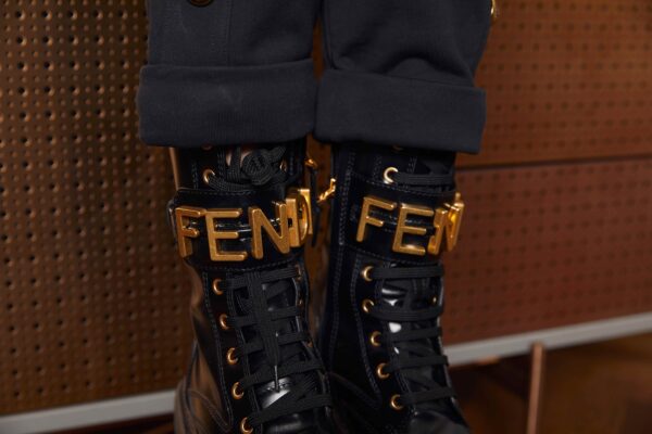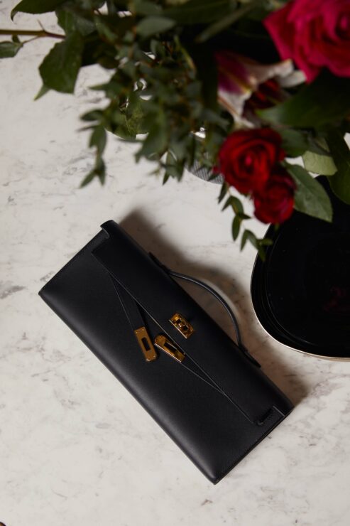 by Loewe, Kelly Cut clutch in black Swift leather with gold hardware by Hermès, Coco Crush bracelet in yellow gold, Coco Crush necklace in beige gold with diamonds, and Pétales de Camélia ring in yellow gold with diamond, all by CHANEL, bracelets by Cartier, and gold necklace with charms