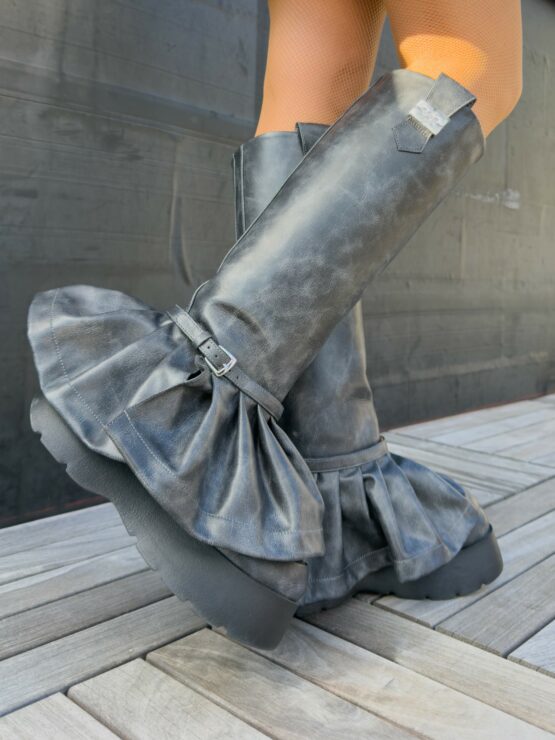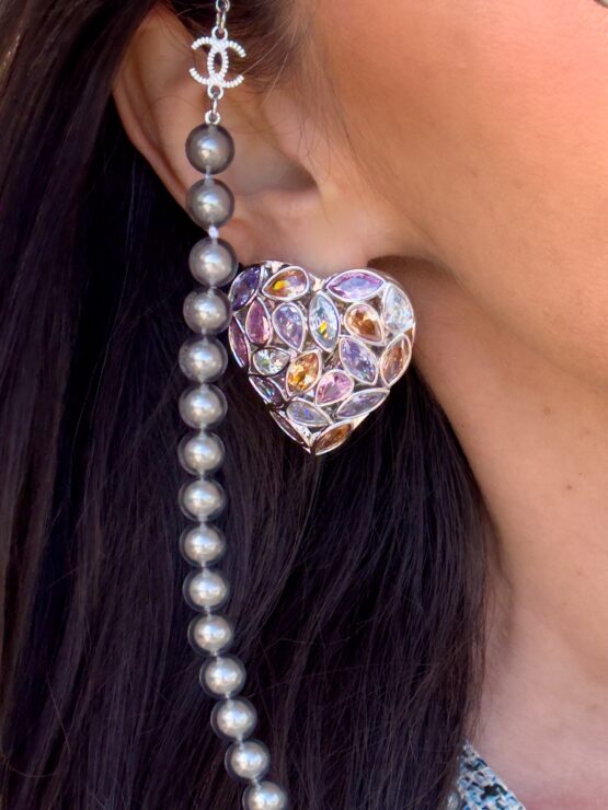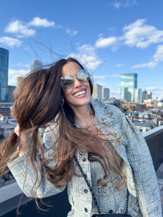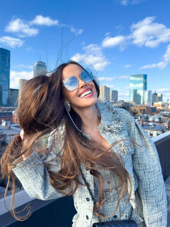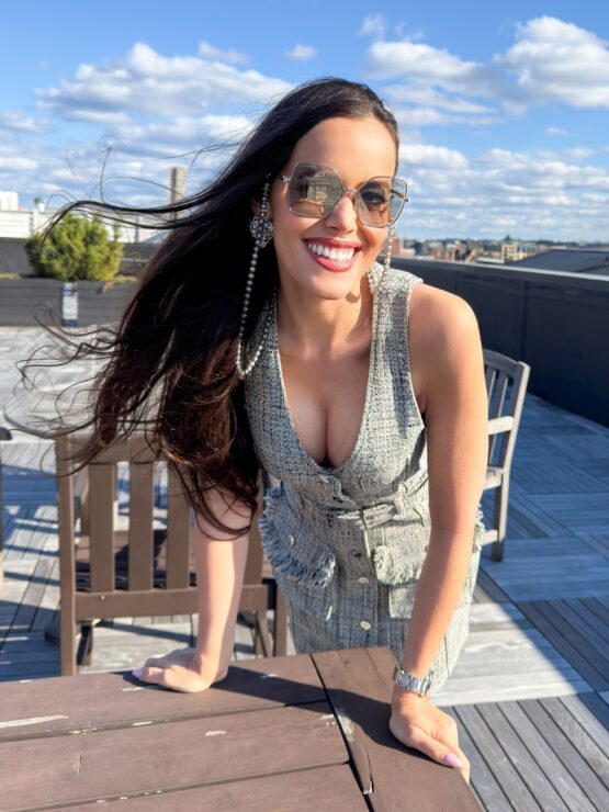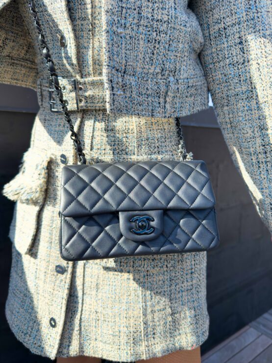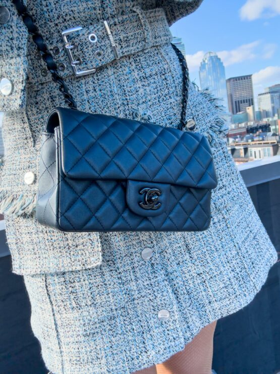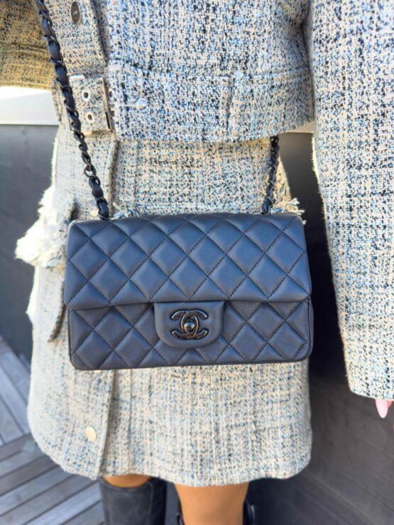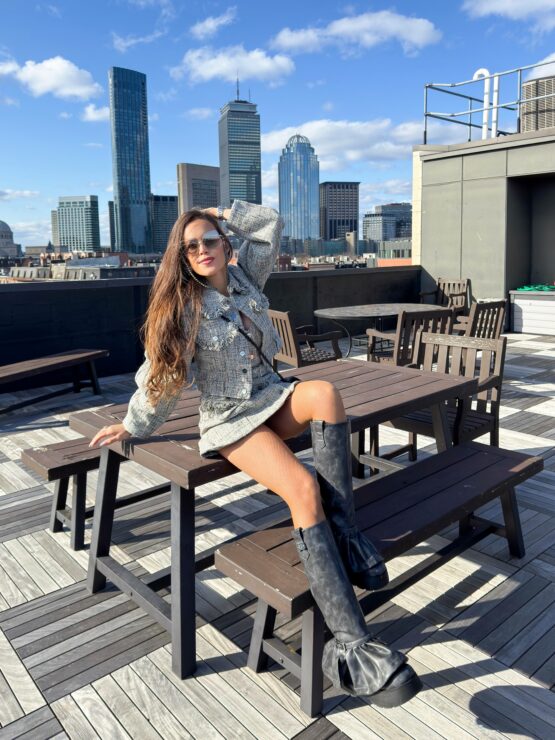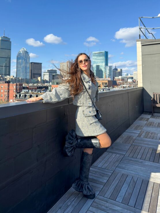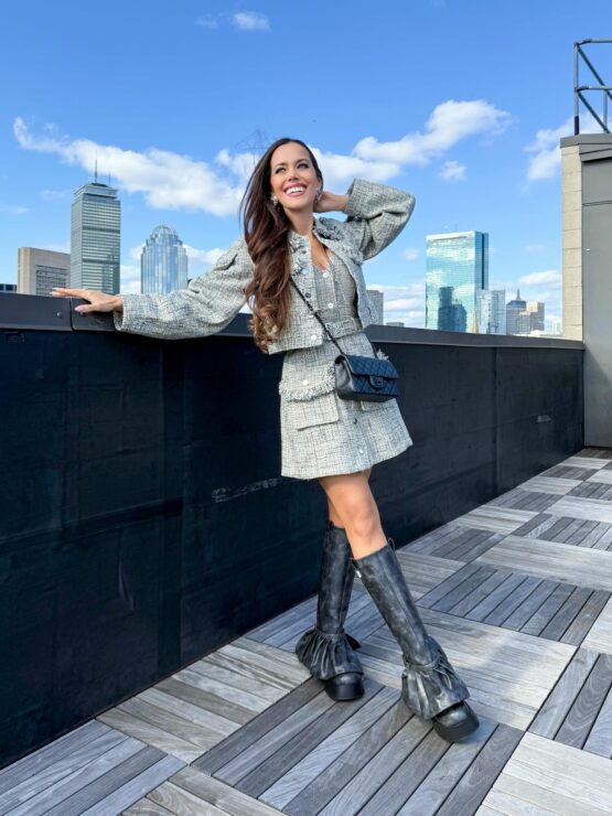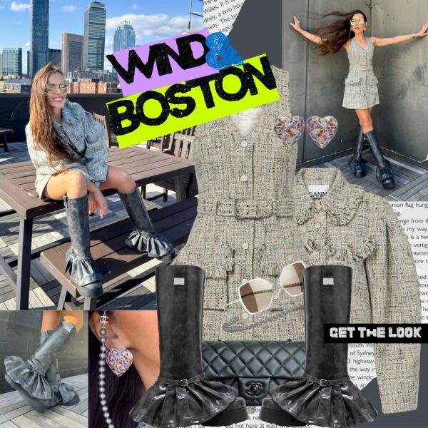 My look: Cropped cotton tweed jacket in blue, matching belted tweed mini dress, and Kat platform boots, all by GANNI, crystal-embellished earrings by Self-Portrait, butterfly sunglasses with grey pearl chain, and mini rectangle flap bag in pearly lambskin with black-tone metal, both by CHANEL.