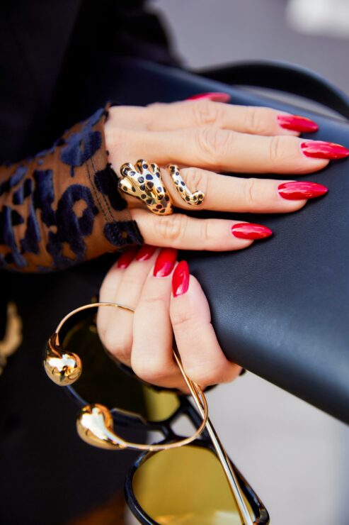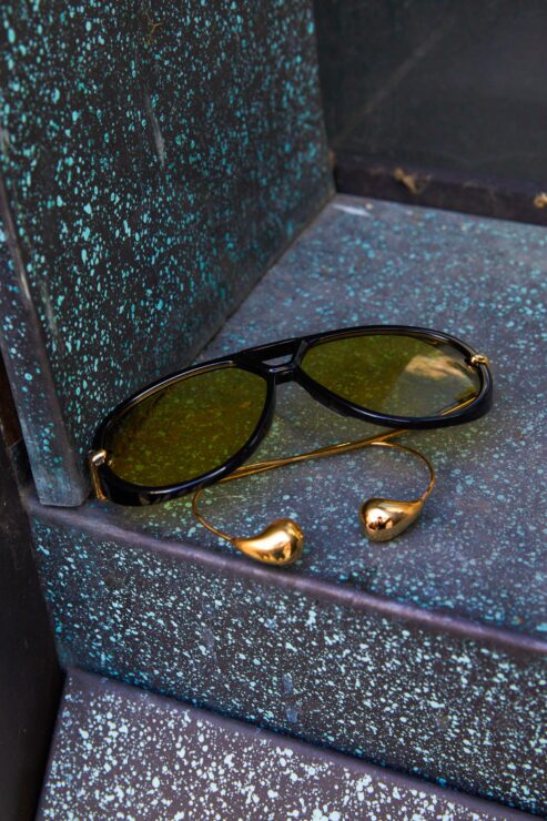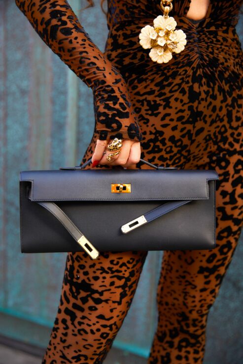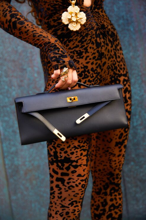by Bottega Veneta, Kelly Pochette Cut clutch in black Swift leather with gold hardware by Hermès, and Mitza ring by Dior Fine Jewellery.
