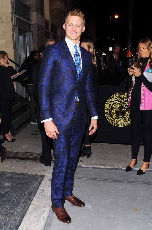 Hunger Games star Alexander Ludwig chose a Fall 2012 look – he wore a blue floral printed suit with matching tie. He completed his look with Versace Fall boots with gold buckles and a black Versace belt with a medusa buckle.