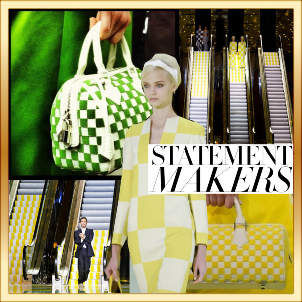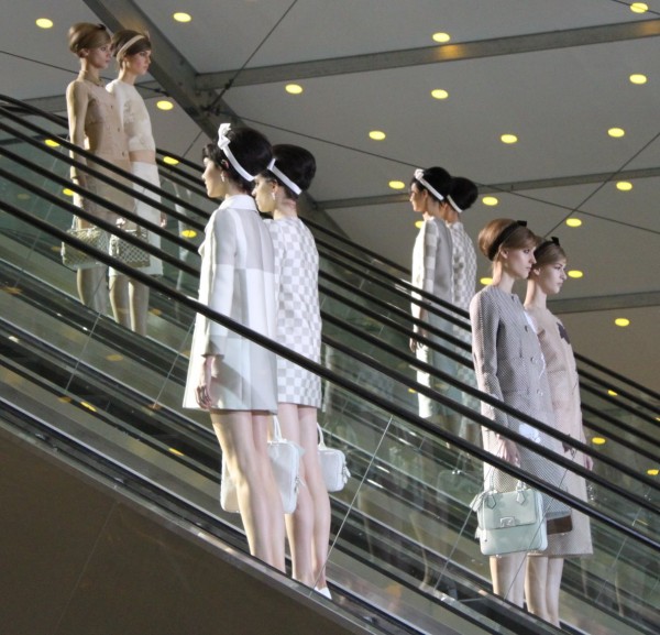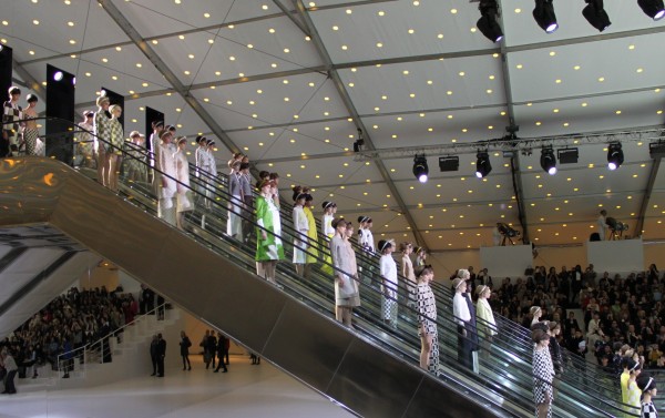 On Wednesday morning, I went to Louis Vuitton‘s S/S 2013 show that was as energizing and different as it was brief because the models walked out in pairs like twins. The setting was once more very special: Four escalators formed the fundamental structure of the presentation inspired by Les Deux Plateaux, a famous installation piece in the Palais Royal by the artist Daniel Buren with columns arranged in a grid.