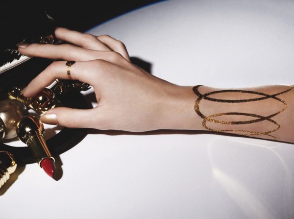 From the early years of his career, Christian Dior was fascinated by gold and its mysterious powers. It wasn’t long before gold became a refined signature of the house and Dior’s most magnificent couture outfits were adorned with gold accessories. Now, Camille Miceli, Dior’s Creative Director of costume jewelry, has created a limited edition set of Golden Tattoos, comprised of 24-karat gold micro particles that melt onto the skin. The set includes seven exclusive designs: two wrist chains, a Dior Dollisimio charm, pearl drop charm with the Christian Dior logo, three rings, and a Line A interlaced bangles.