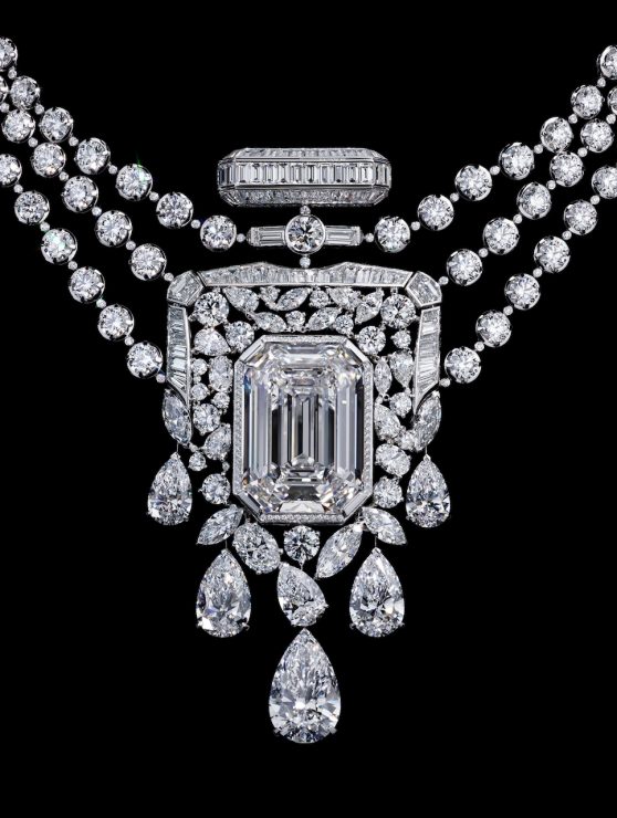 The harmonious shape, in an emerald cut, the symbolic weight of 55.55 carats, the D Flawless quality of this stone and the 18-carat white gold bezel set with 104 round diamonds and 42 baguette diamonds testify to CHANEL’s perfectionism and exceptional levels of creation and technical mastery. The profile of the stopper, the silhouette of the bottle, the fastener shaped like the lucky number, and the cascading of pear-shaped diamonds in different sizes, cut one by one, mould this piece into an ultimate tribute to the perfume.