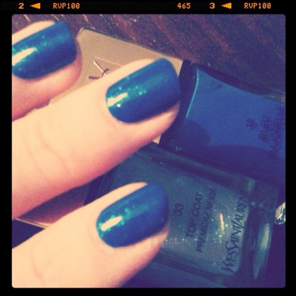 I absolutely adore the combination of LA LACQUE COUTURE N° 18 Bleu Majorelle (from YSL’s summer look 2012) with the Limited Edition Top Coat N°33 Première Neige. Hope that you will like it, too. The collection is in stores now.