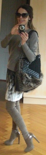 Moreover, I truly adore the brand’s iconic saddle-printed silks in dégradé, a dip-dyed hem. The printed silk-crepe mini skirt (see below) had to be mine. I already wore it with a greige sweater by Stella McCartney, a patchwork Chanel bag and my beloved suede overknees by Gucci, all from F/W 2010. This is a great way of working your new cruise pieces into your winter wardrobe.