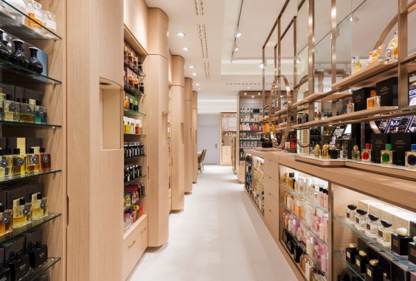 The idea for the interior design came up with the decision to integrate the world’s first and extremely exclusive La Prairie Lounge in the new design of the luxury brand. The premises are designed in warm natural colors and earthy tones, creating a homely yet elegant ambience. The carefully curated offer of selected niche fragrances, makeup products, luxury toiletries and accessories got more space are presented in a sophisticated way inviting customers to stroll through the corridors.