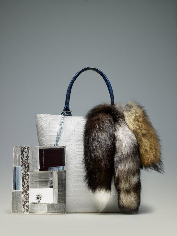 Josephine Meckseper/ Nancy Gonzalez 2012 crocodile with suede lining, fur tails and metal fixture, acrylic, fabric, and paper on canvas with metal chain. Josephine Meckseper built upon the handbag to create a wearable sculpture.