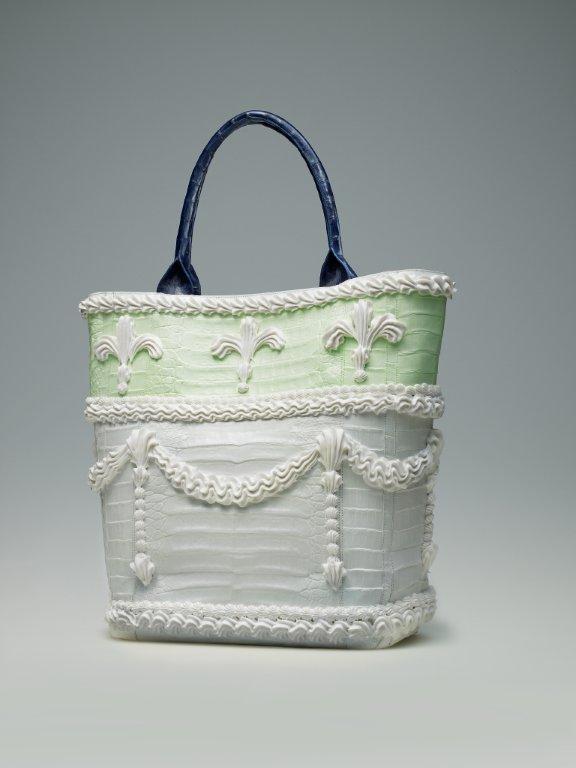 Will Cotton/ Nancy Gonzalez 2012 crocodile with suede lining and acrylic polymer. Will Cotton used the tools and vocabulary of cake decoration to re-imagine the bag as a frosted confection.