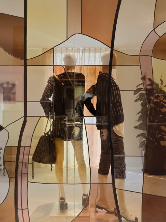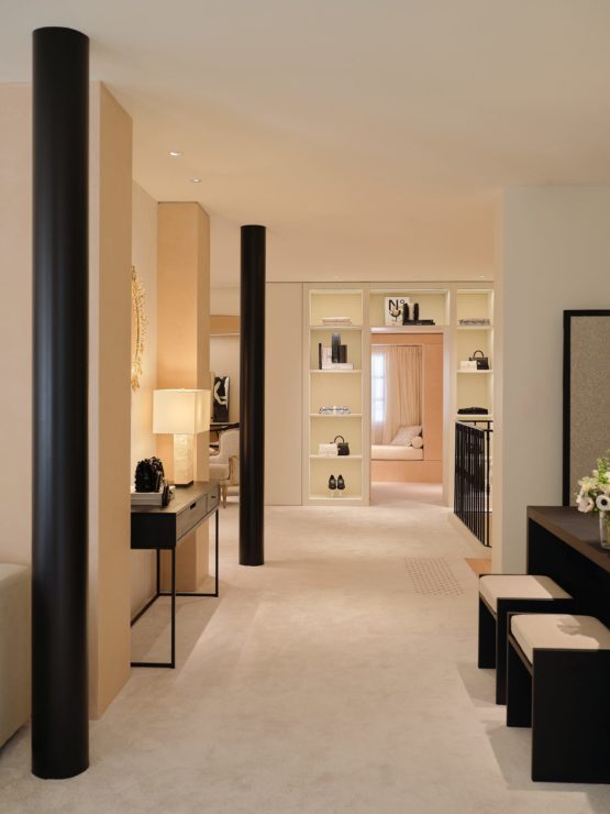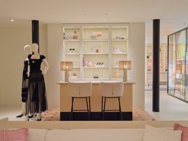 The floor devoted to ready-to-wear can be reached either by a stone staircase or an all-glass elevator that plays with transparency and light. The S/S 2024 ready-to-wear collection as well as the 2023/24 Métiers d’art collection – unveiled last December in Manchester – are presented here. Two areas, each with a salon and dedicated fitting room, complete the ensemble. For an exclusive experience, one of them can be privatised. Hand-painted curtains cast a light, airy feel over the surfaces while bespoke rattan furniture, touches of powder pink and raffia create a warm ambiance in keeping with the spirit of Provence.
